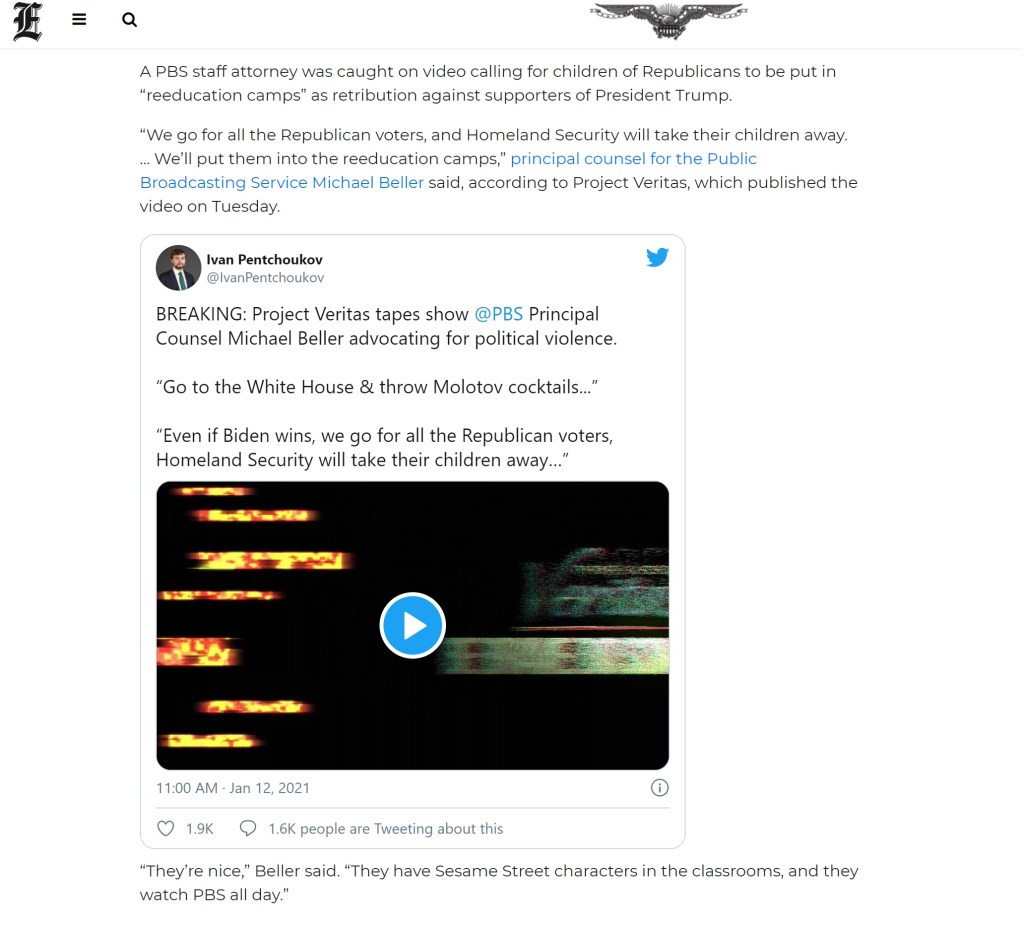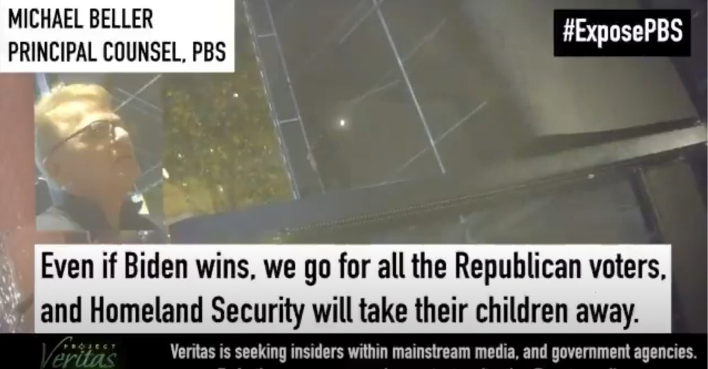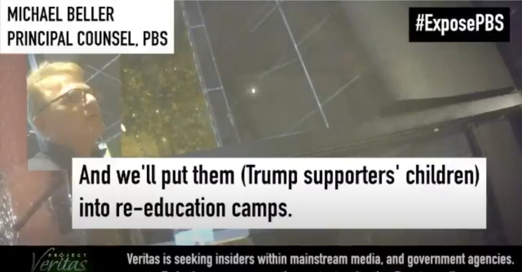 I recently read from the Washington Examiner with embedded video, where the PBS lawyer specifically calls out and states in part, “…Even if Biden wins, we go for all Republican voters, and Homeland Security will take their children away. And we’ll put them (Trump supporters’ children) into re-education camps.”