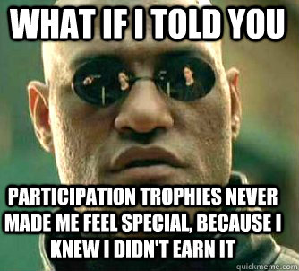 Here is where the “Participation Trophy” analogy rests & ties into everything… A participation trophy is a trophy given to children who participate in a sporting event but do not finish in first, second or third place, and so would not normally be eligible for a trophy. These such things, in my honest opinion, has the unintended consequence of “entitlement” to the participants who received a trophy – not being first, second or third place – but just for participating.