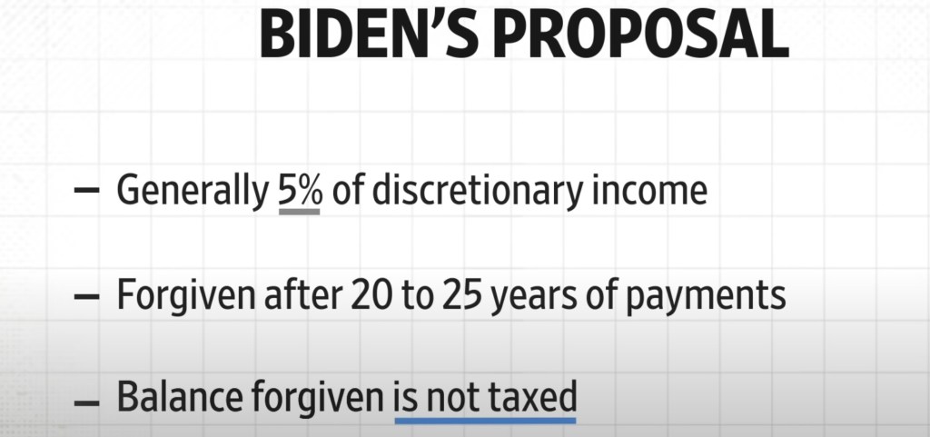 Again, what I may see happen are unintended consequences once everything has been implemented and a few years pass after everything has been said and done. What people may not understand, beforehand, that student loan forgiveness has been tried under the Clinton administration (REPAYE) – as indicated in the video above – there was a repayment plan but the remaining balance forgiven was then TAXABLE AS INCOME to you (the remaining of the loan that was forgiven):