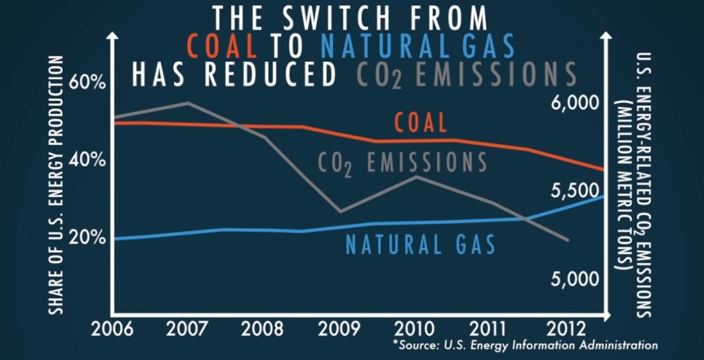 Surprisingly, in the video above, the United States has greatly reduced carbon emissions with constant development and innovation on current energy sources – natural gas, etc.