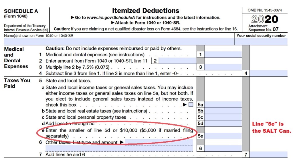 To compare the SALT limitations – So in simpler terms (how I interpret) the SALT cap that is currently in place and maxed at $10,000 (under the Trump Administration). This $10,000 is the TOTAL allowed deduction for state and local taxes (SALT acronym) PLUS your property taxes on your primary residence/home. To help visualize the $10,000 deduction – this amount is reported on a Schedule A – “Itemized Deductions” if you are claiming these types of deductions when you file your Form 1040 each year. This form is to report your property taxes paid on your primary house, state and local taxes paid, mortgage interest, donations to charity, etc. etc.